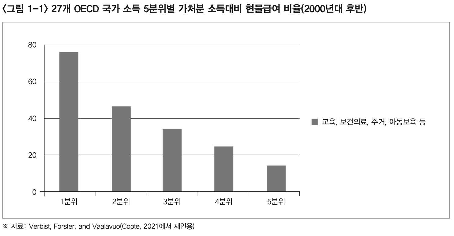 형평성에 있어서 기본서비스는 가장 기본적으로 사회임금(social wage)을 제공함으로써 소득 불평등을 완화시키는 효과를 가져오고 있다. 삶에 필수적인 서비스를 무상 또는 일부 비용부담만으로 제공함으로써 개인 소득에서 소진될 수 있는 부분을 보충해주는 효과를 갖는 것이다. 또한 이러한 소득보전 효과는 상당한 재분배 효과 또한 만들어내고 있다. [그림 1]에서 OECD 국가들의 현물급여(서비스)가 가처분 소득에서 차지하는 비율이 소득 5분위의 최하위 1분위에서는 76%에 달하는 반면 최상위 5분위에서는 20%에 미치지 못하는 것이다. 따라서 기본서비스는 현급이전을 직접적인 재분배 없이도 보편적인 서비스만을 통해서 상당한 재분배의 효과를 가져올 수 있다는 것이다(Coote, 2021).